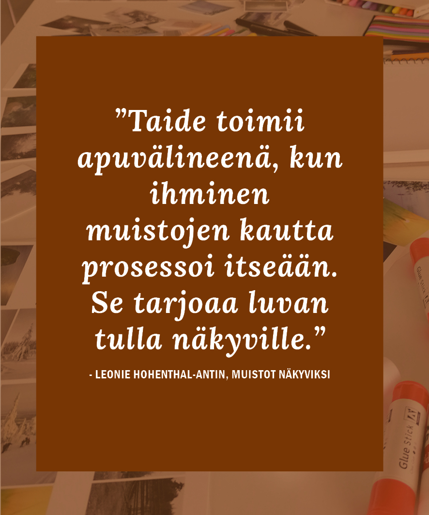 Olen tutkinut muistelutyön menetelmiä ja valokuvaterapeuttisia lähestymistapoja useita vuosia. Valokuvalla on mittaamattoman upea kyky palauttaa meidät hetkiin ja kokemuksiin minuutin tarkasti ja siksi nautin sen kanssa työskentelystä valtavasti. Tiedän, että valokuva kykenee palauttamaan meille muistoja, joita emme edes muistaneet muistavamme. Joskus sanojen virta löytyy sieltä, mihin sanat eivät yllä ja se on valokuvan mahtavinta voimaa.